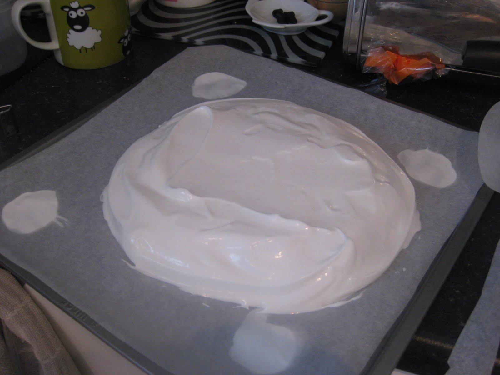 The egg whites were whipped until stiff. You add the sugar whilst it is whipping which turns the mixture lovely and glossy.